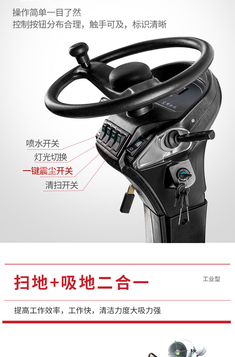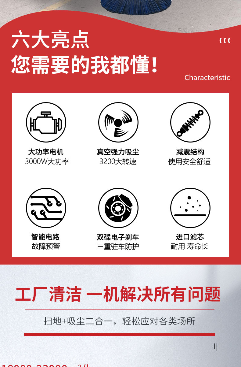- HRD-2000S全封閉駕駛式掃地車配置雙風機系統,具有強大的吸塵能力,清掃寬度大可達2米,一小時工作量相當于6-8名清潔工的工作量,可連續工作6-8小時,特別適合煤礦、水泥廠、雕刻廠、面粉廠、建材廠、金屬冶煉廠、工廠車間、商場、車站、廣場公園、景區等場所使用。