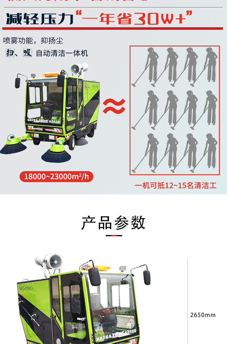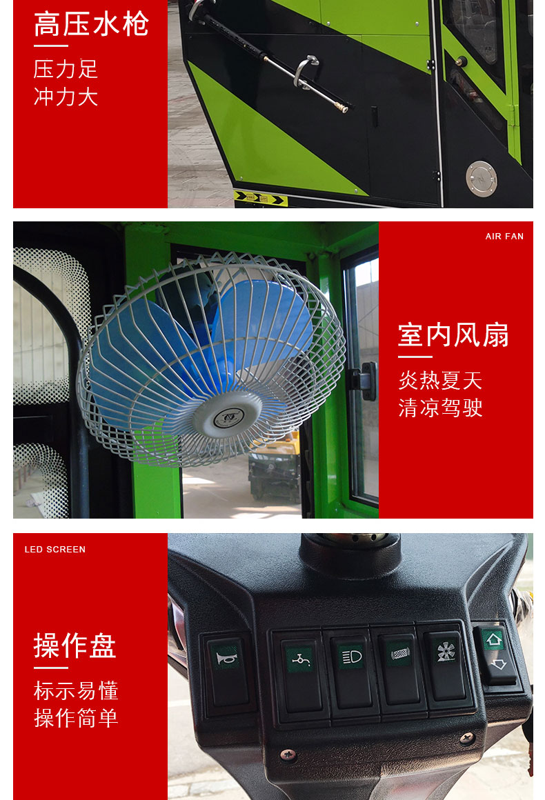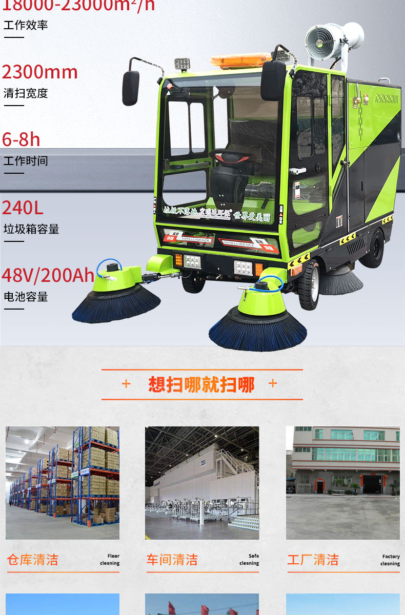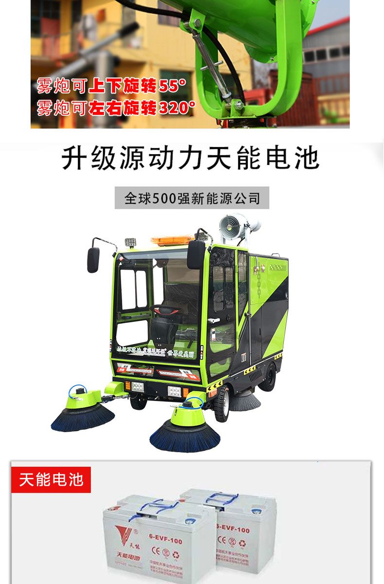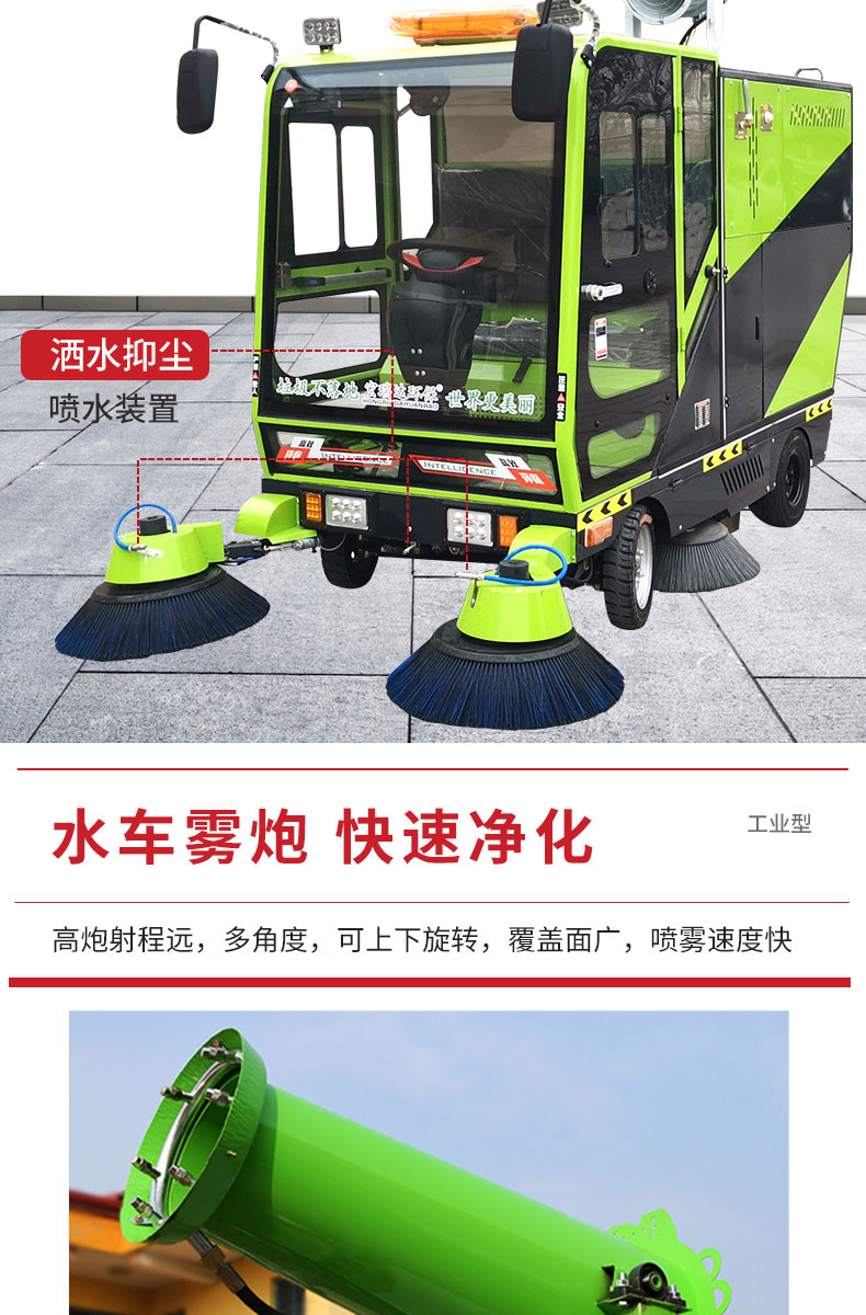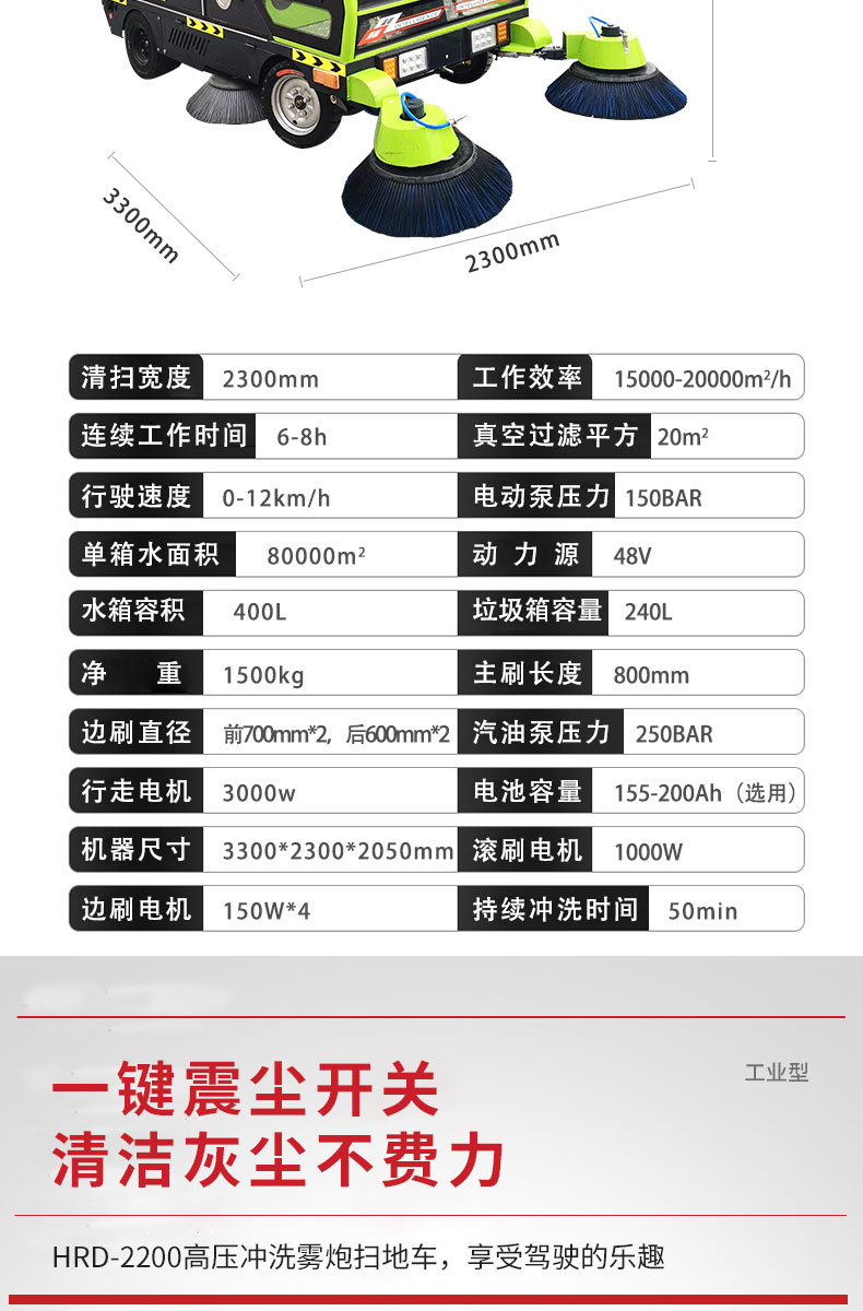 HRD-2200高壓清洗霧炮四輪掃地車及清掃、灑水、噴霧、清洗為一體,清掃寬度可達2300mm,可連續工作6-8個小時,灰塵 石子 落葉 煙頭煙灰 木屑 瓜果等一掃而凈,特別適合煤礦、水泥廠、雕刻廠、面粉廠、建材廠、金屬冶煉廠、工廠車間、商場、車站、學校、機場外圍、廣場公園、景區等場所使用。