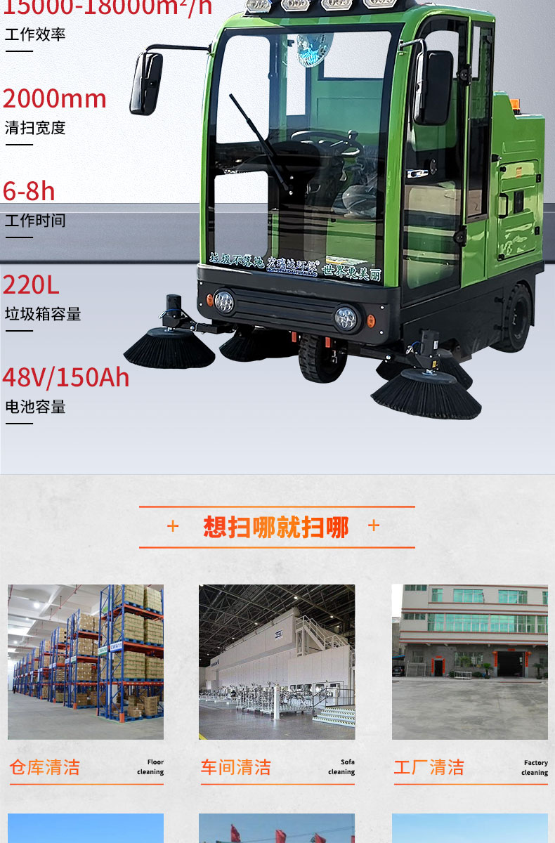 - HRD-2150全封閉駕駛式掃地車是宏瑞達(dá)環(huán)保根據(jù)市場(chǎng)客戶需求特研發(fā)針對(duì)粉塵企業(yè)的電動(dòng)清掃車,配置雙風(fēng)機(jī)系統(tǒng),具有強(qiáng)大的吸塵能力,清掃寬度大可達(dá)2米,連續(xù)工作時(shí)間可達(dá)6-8小時(shí),特別適合煤礦、水泥廠、雕刻廠、面粉廠、建材廠、金屬冶煉廠這種灰塵多的場(chǎng)所使用,用于工廠車間、商場(chǎng)、車站、廣場(chǎng)公園、景區(qū)等場(chǎng)所清掃效果會(huì)更加顯著。