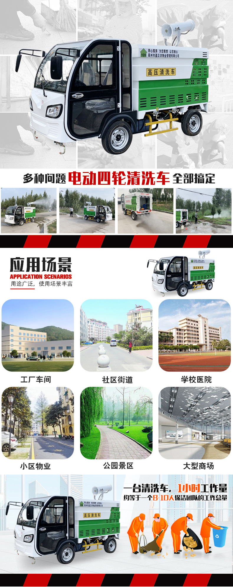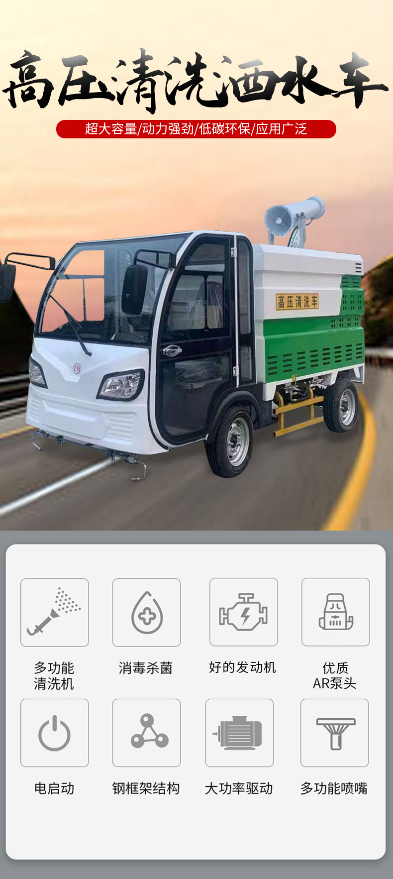 車。產(chǎn)品采用優(yōu)質(zhì)電動(dòng)四輪車底盤,裝配專業(yè)的高壓清洗機(jī)和水泵,使用方便快捷。內(nèi)置不銹鋼水箱,永久防銹,是城市街道、物業(yè)小區(qū)保潔性價(jià)比最高的沖洗車產(chǎn)品!