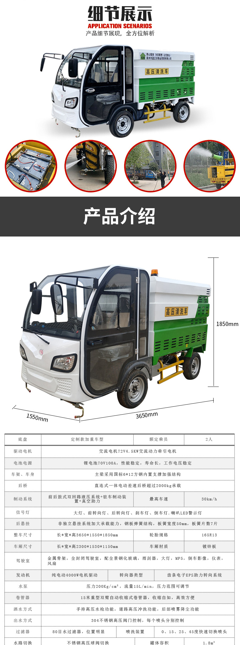 - 電動四輪清洗車采用新能源電池為動力,更環保。該車具備多種清洗功能,主要用于人 行道、小街巷道的沖掃,以及垃圾桶、果皮箱、公共設施的沖刷等;車輛體積小、易轉彎、噪 音低、零排放。
