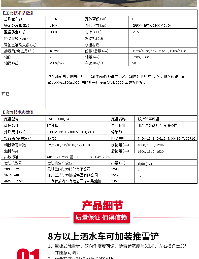 - 灑水車適合于各種路面沖洗,樹木、綠化帶、草坪綠化,道路、廠礦企業施工建設,高空建筑沖洗。具有灑水、壓塵、高、低位噴灑,農藥噴灑、護欄沖洗等功能,還具有運水、排水,應急消防。