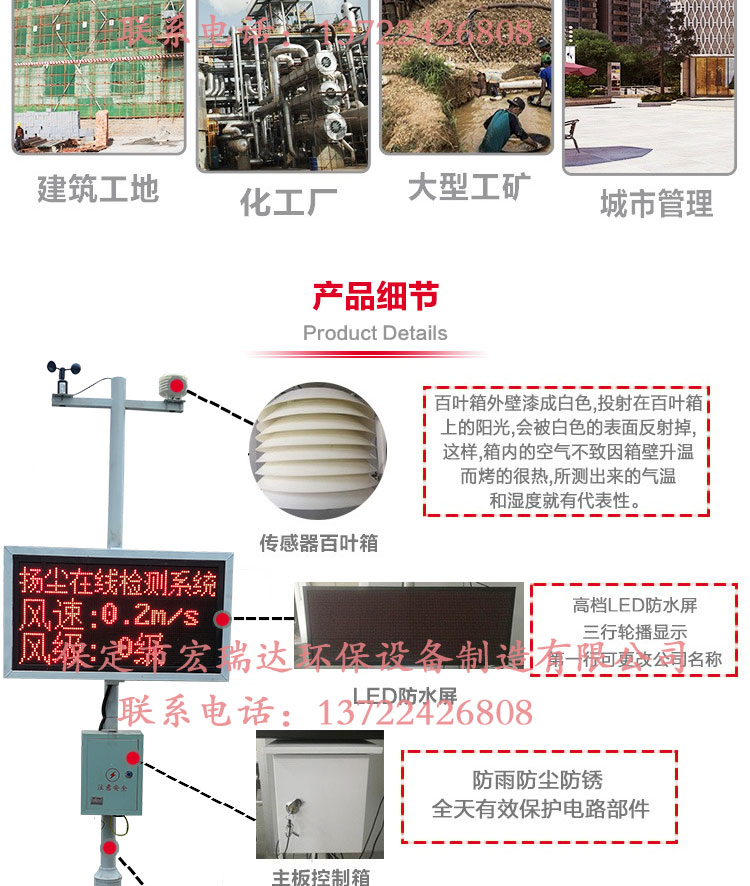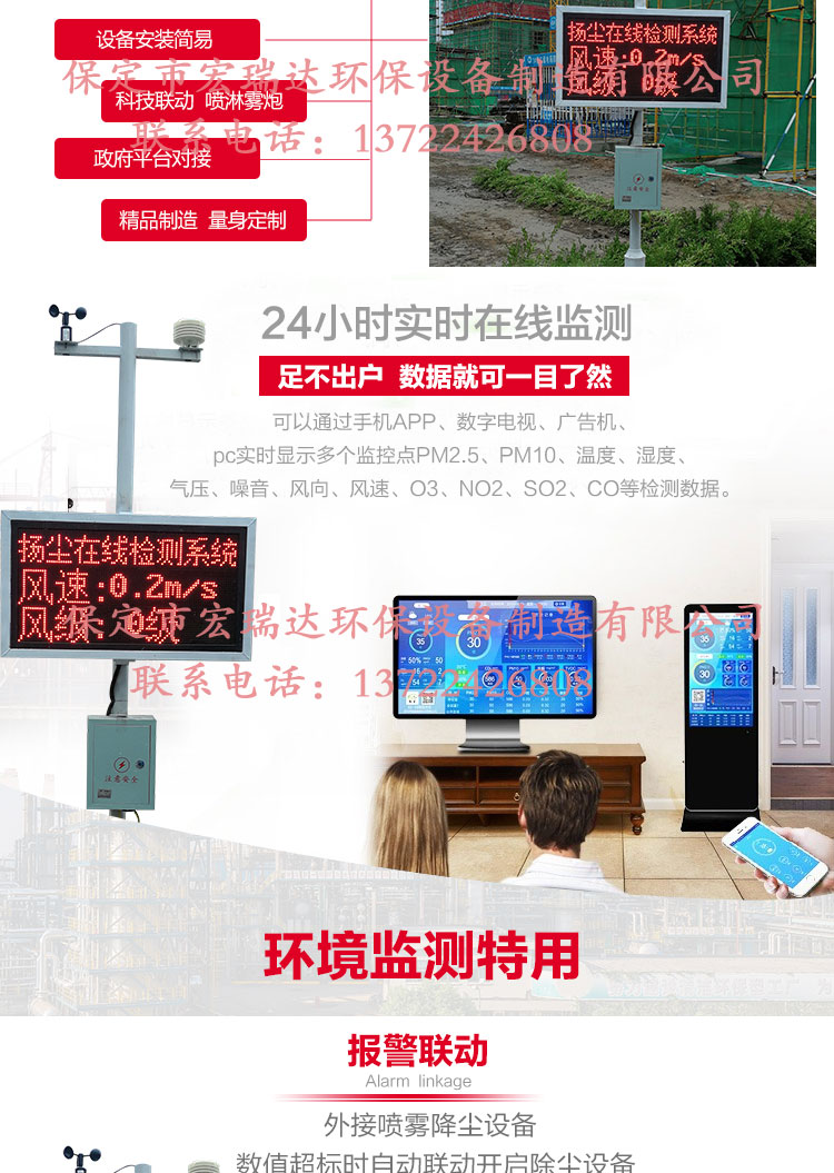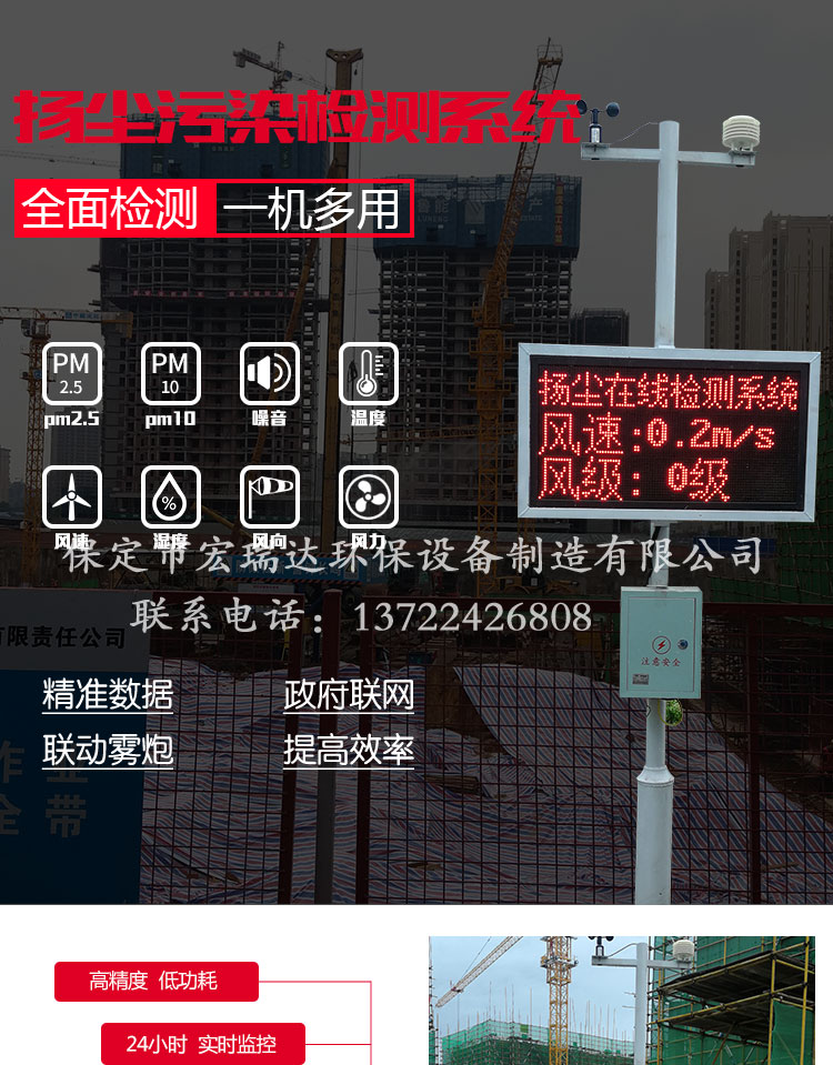 2 4小時在線揚塵監測系統是保定宏瑞達環保設備制造有限公司為改善空氣質量自主研發的24小時戶外揚塵監控的一個終端設備。本設備實現多維一體化,除了可以實現揚塵監控以外,還可以測TSP