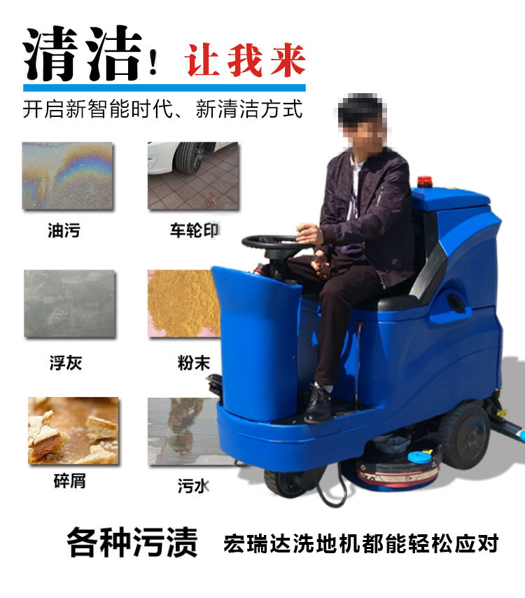宏瑞達駕駛式洗地機具有清洗寬度大,速度快,每小時可清洗3000平米左右;吸力強,污水一吸而凈;低噪音無污染;集掃洗拖一體,干凈;工作時間長,可持續工作4-6小時,一臺洗地機相當于6-10保潔的工作量,工作節省人工,駕駛式洗地機機身設計靈活輕便,對于邊角、窄道都可清潔。操作簡便易上手,性能穩定故障率低。