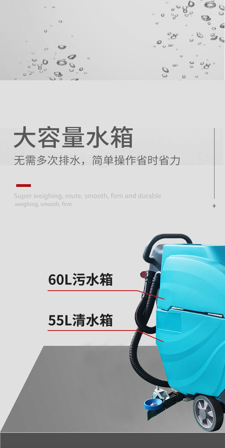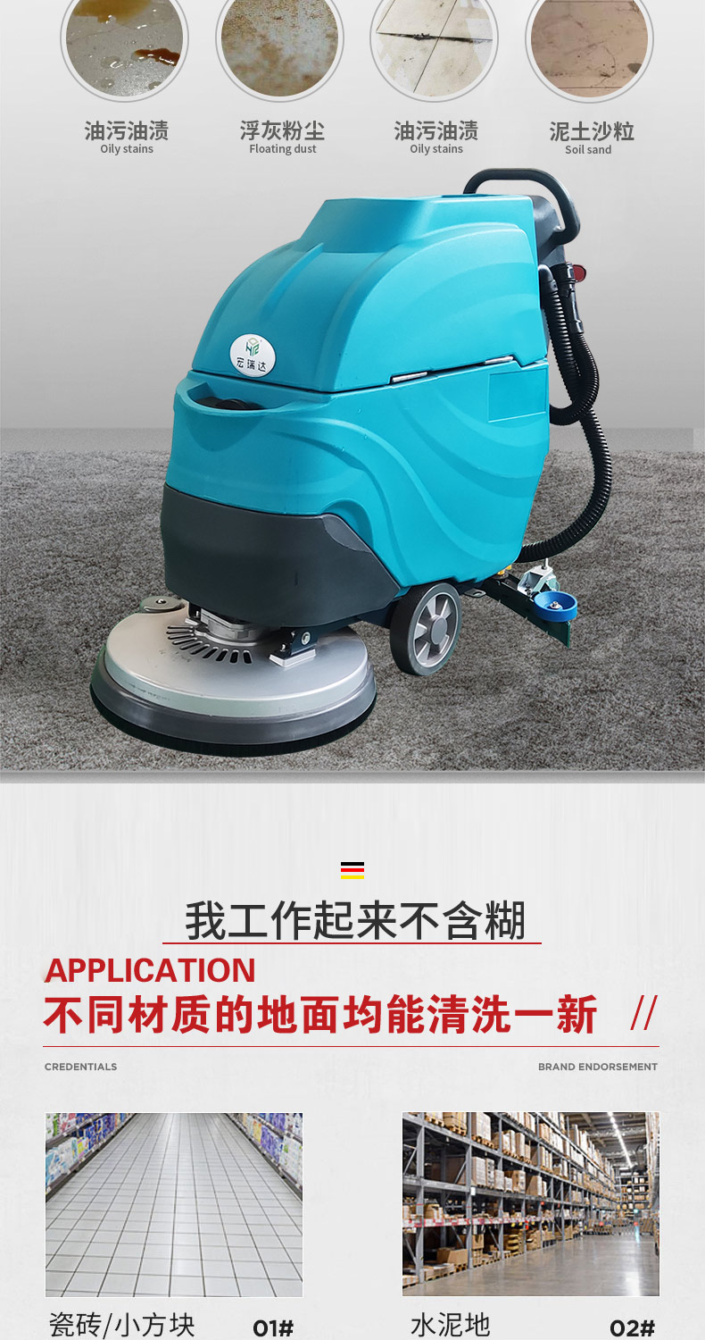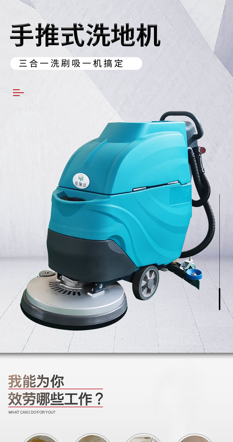 - HRD-X55手推式全自動洗地機清洗效率可達3000m2 h,充滿電可連續工作3-4小時,低噪音,操作簡單,清洗地面的同時吸干污水,并將污水帶離現場,具有低碳、節能、高效等優點,適用領域廣泛,車站、碼頭、機場、車間、倉庫、學校、醫院、飯店、賣場、寫字樓商廈、酒店賓館、公園廣場等場所都可以使用。適用于瓷磚地面、石料地面、環氧地面、金剛砂地面、水磨石地面、塑膠地板、玻化磚、PVC地面等硬質地面的表面油污等污垢清潔。