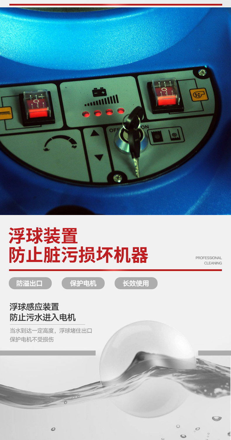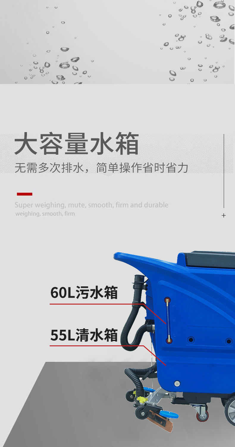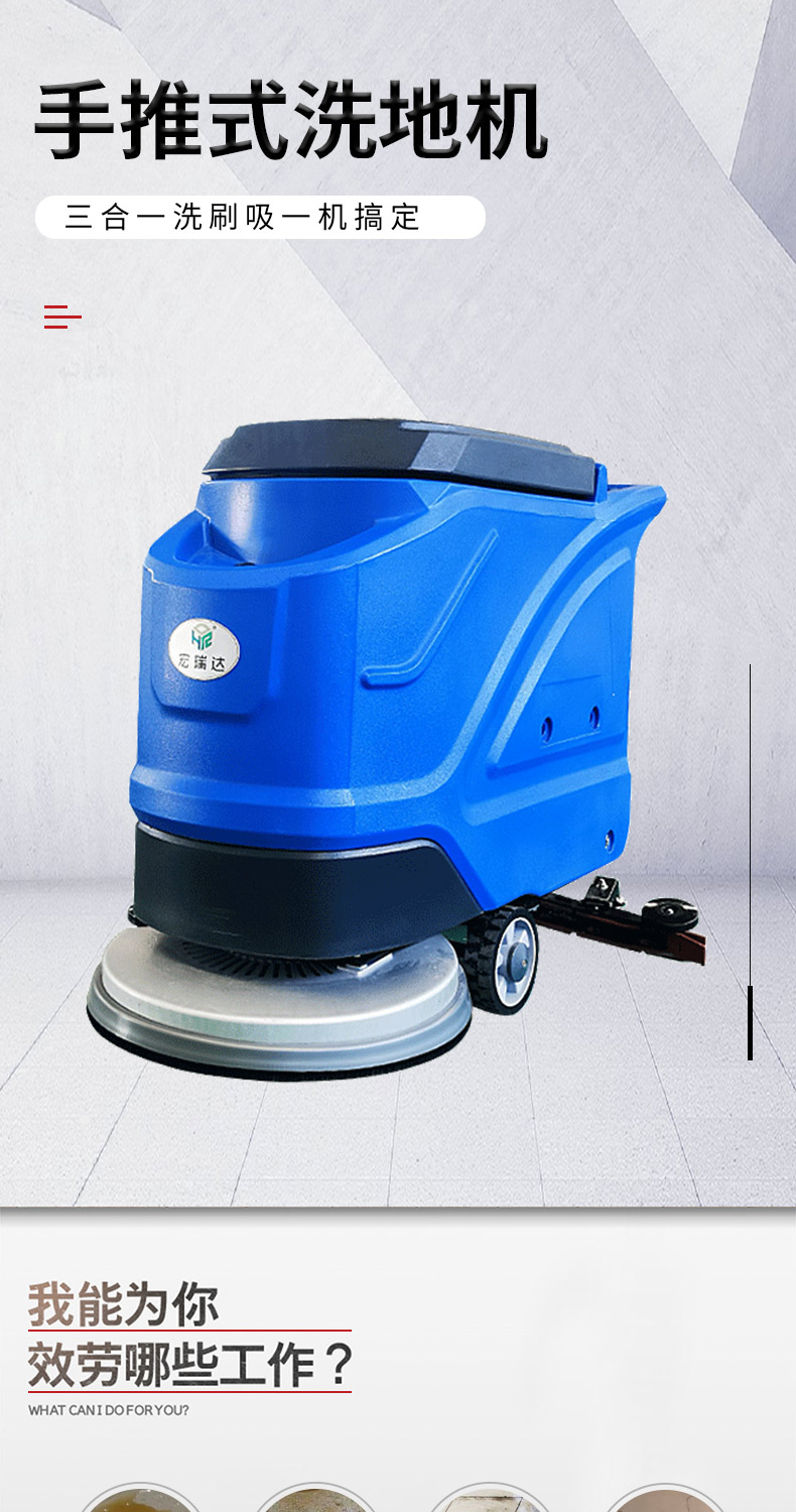 - 手推式洗地機洗地、吸干同步完成,同時將污水及其他污染源帶離現場,它的效率是人工清潔的15倍以上,人性化的設計,符合使用習慣,一鍵式操控,全自動清洗,操作人員僅需手推把握方向即可,無需具備專業知識即可輕松掌握,讓我們邁向智能化清潔之路變得簡單、可行,采用低噪音設計,將機器工作的負面影響降到最低,讓您白天、晚上都可安心工作,在收獲潔凈環境的同時,樹立起良好的工作形象,電池供電,讓它能夠自由無障礙行走,推到哪洗到哪,輕松自由