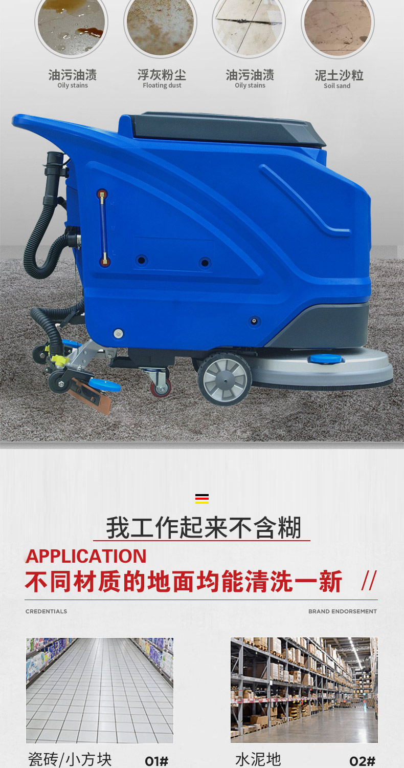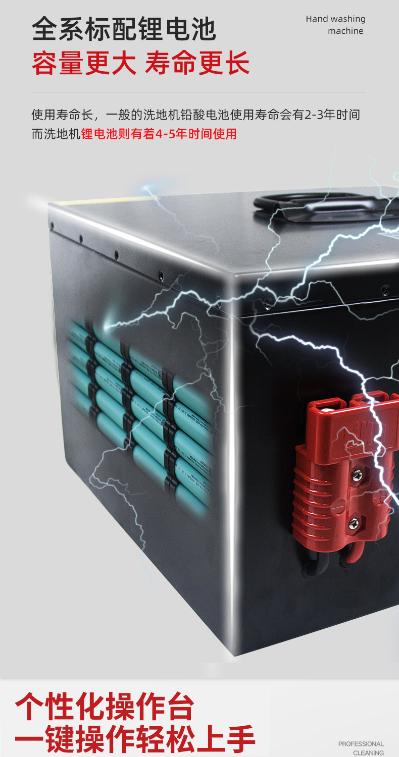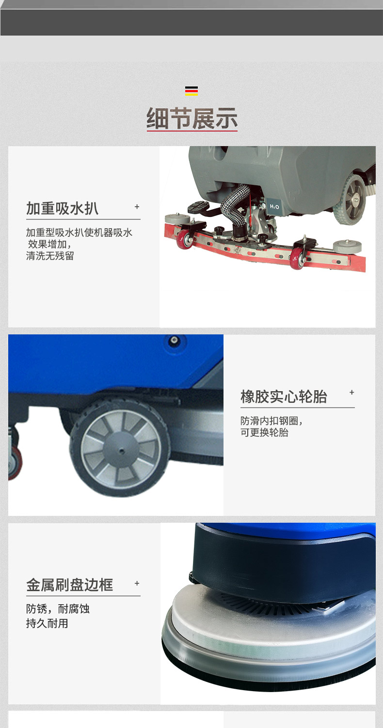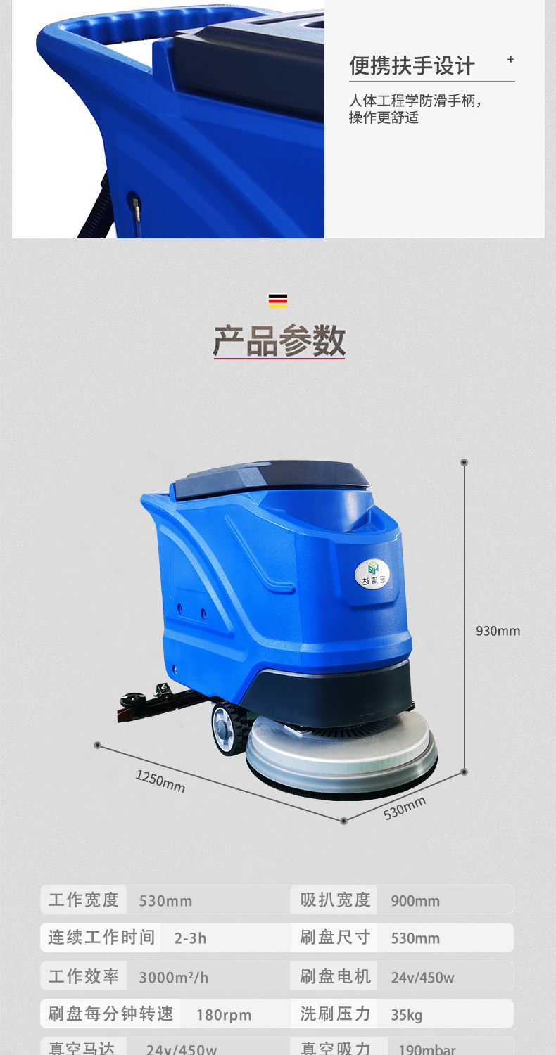 - 手推式洗地機洗地、吸干同步完成,同時將污水及其他污染源帶離現場,它的效率是人工清潔的15倍以上,人性化的設計,符合使用習慣,一鍵式操控,全自動清洗,操作人員僅需手推把握方向即可,無需具備專業知識即可輕松掌握,讓我們邁向智能化清潔之路變得簡單、可行,采用低噪音設計,將機器工作的負面影響降到最低,讓您白天、晚上都可安心工作,在收獲潔凈環境的同時,樹立起良好的工作形象,電池供電,讓它能夠自由無障礙行走,推到哪洗到哪,輕松自由