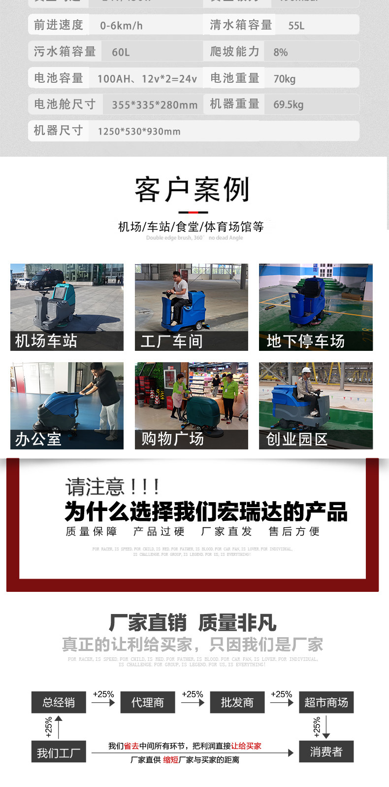 手推式洗地機洗地、吸干同步完成,同時將污水及其他污染源帶離現場,它的效率是人工清潔的15倍以上,人性化的設計,符合使用習慣,一鍵式操控,全自動清洗,操作人員僅需手推把握方向即可,無需具備專業知識即可輕松掌握,讓我們邁向智能化清潔之路變得簡單、可行,采用低噪音設計,將機器工作的負面影響降到最低,讓您白天、晚上都可安心工作,在收獲潔凈環境的同時,樹立起良好的工作形象,電池供電,讓它能夠自由無障礙行走,推到哪洗到哪,輕松自由