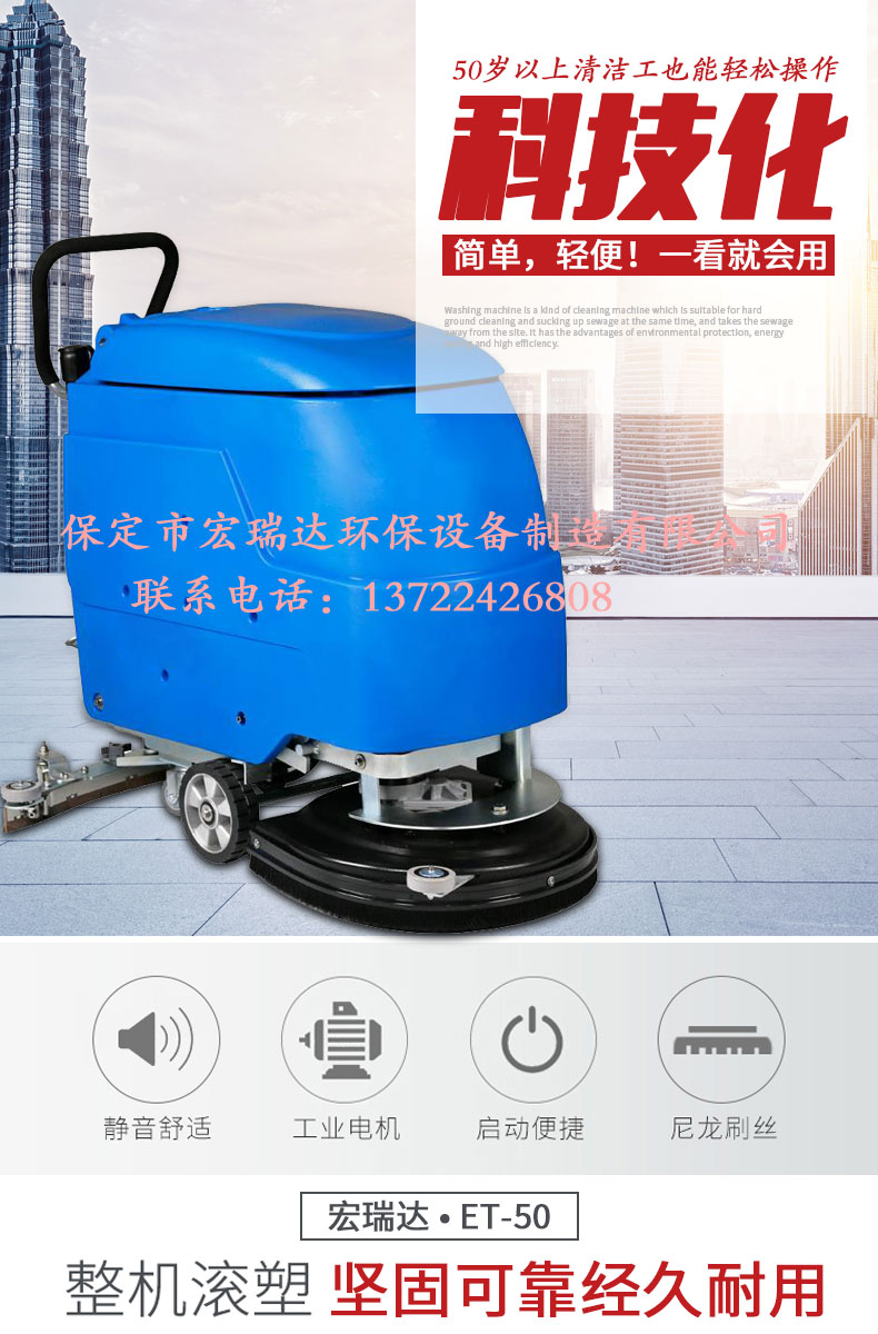 - HRD-X50手推式全自動洗地機清洗效率可達3000m2 h,充滿電可連續工作3-4小時,低噪音,操作簡單,清洗地面的同時吸干污水,并將污水帶離現場,具有低碳、節能、高效等優點,適用領域廣泛,車站、碼頭、機場、車間、倉庫、學校、醫院、飯店、賣場、寫字樓商廈、酒店賓館、公園廣場等場所都可以使用。適用于瓷磚地面、石料地面、環氧地面、金剛砂地面、水磨石地面、塑膠地板、玻化磚、PVC地面等硬質地面的表面油污等污垢清潔。