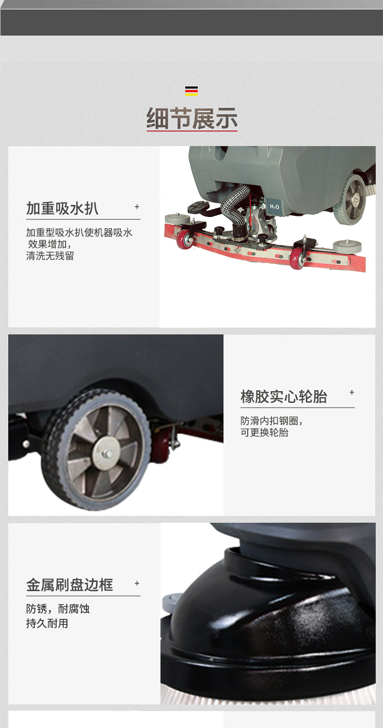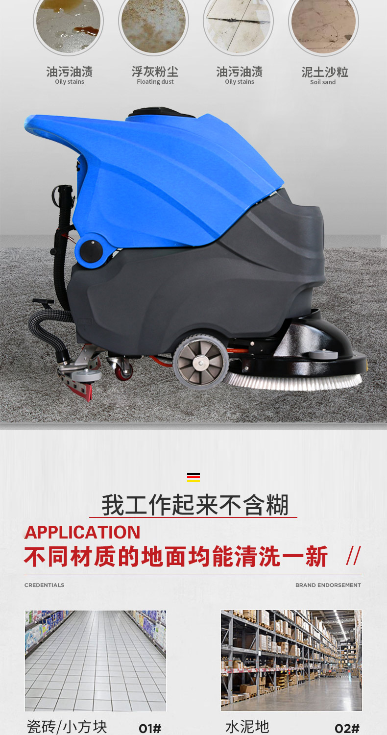 HRD-X55手推式全自動洗地機清洗效率可達3000m2 h,充滿電可連續(xù)工作3-4小時,低噪音,操作簡單,清洗地面的同時吸干污水,并將污水帶離現(xiàn)場,具有低碳、節(jié)能、高效等優(yōu)點,適用領(lǐng)域廣泛,車站、碼頭、機場、車間、倉庫、學校、醫(yī)院、飯店、賣場、寫字樓商廈、酒店賓館、公園廣場等場所都可以使用。適用于瓷磚地面、石料地面、環(huán)氧地面、金剛砂地面、水磨石地面、塑膠地板、?;u、PVC地面等硬質(zhì)地面的表面油污等污垢清潔。
